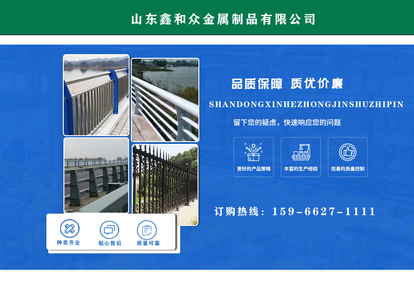 山東鑫和眾金屬制品有限公司主要產(chǎn)品有防撞護欄,橋梁護欄,道路護欄,河道護欄,不銹鋼護欄等護欄。提供設(shè)計方案,一站式定制,包您滿意價格優(yōu)惠,歡迎來電咨詢! 公司常年從事銷售護欄防撞護欄,橋梁護欄,道路護欄,河道護欄,不銹鋼護欄,橋梁鋼護欄,河道燈光護欄等。產(chǎn)品廣泛應(yīng)用于橋梁、河道、旅游景區(qū)、道路、公路、公園、小區(qū)、景觀、道路防撞等領(lǐng)域。 公司產(chǎn)品均采用優(yōu)質(zhì)不銹鋼材料,符合相關(guān)標準。各種型號不銹鋼復合管及護欄,質(zhì)量嚴格把控。產(chǎn)品強度高、耐腐蝕、焊接牢固、抗沖擊、性能好,防撞護欄結(jié)構(gòu)簡單、美觀實用大方。 歡迎前來訂購!...